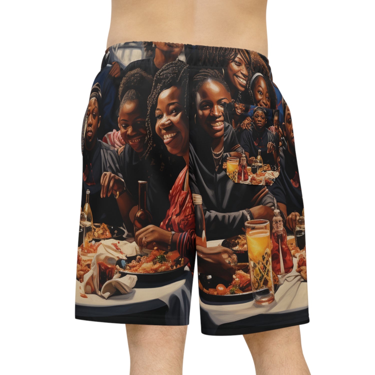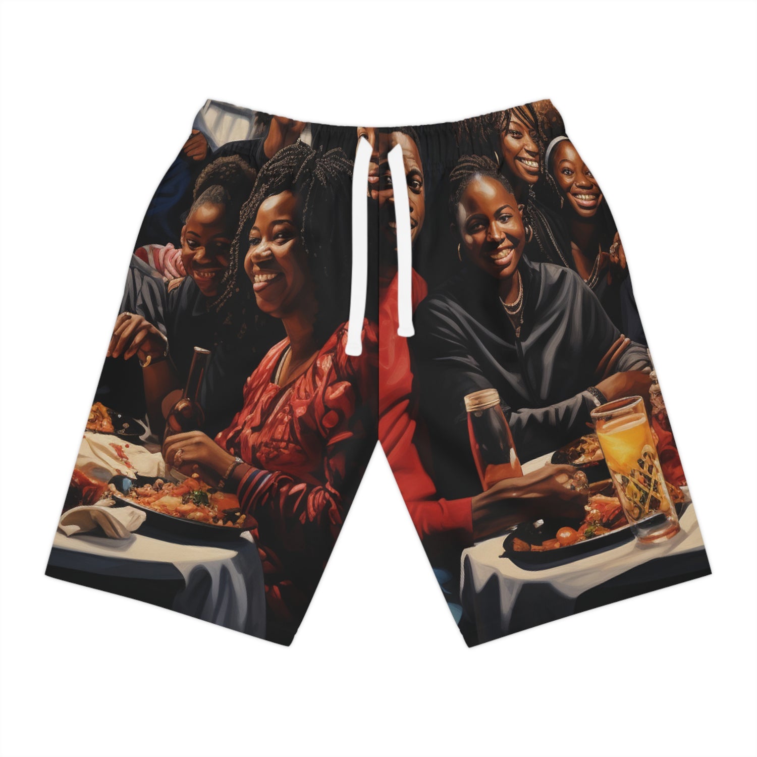 Stay comfortable all summer relaxing with a pair of shorts featuring an ultra realistic abstract oil painting of a black big family celebration. The painting, with food being served in the background, is sure to turn heads in your everyday life. These shorts make casual fashion interesting as well as fun. #BlackFamily #OilPainting #RealisticArt #CasualFashion #SummerVibes #ComfyShorts #Fashionista #AbstractStyle #CheerfulFamilies #FamilyCelebration #FeelGoodVibes