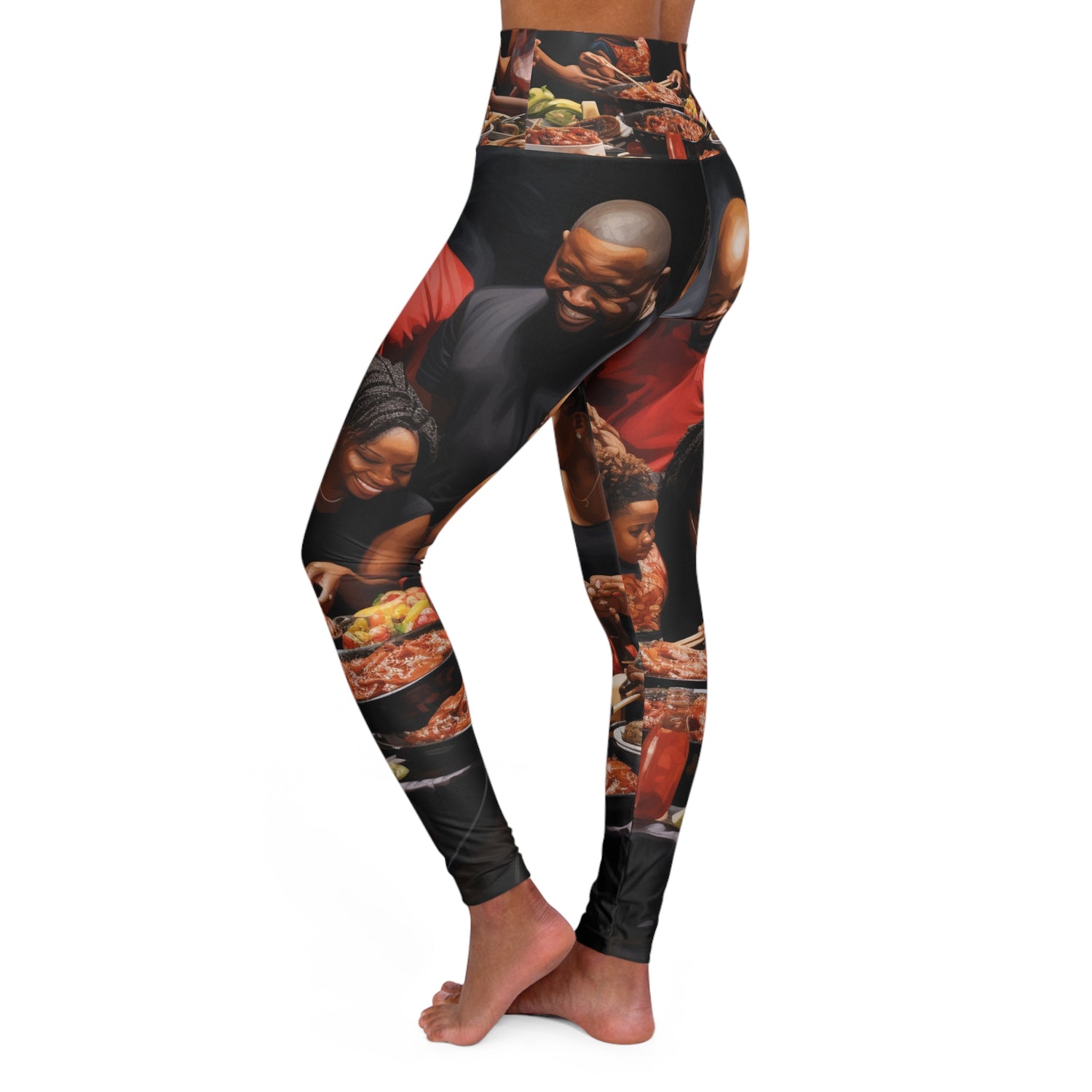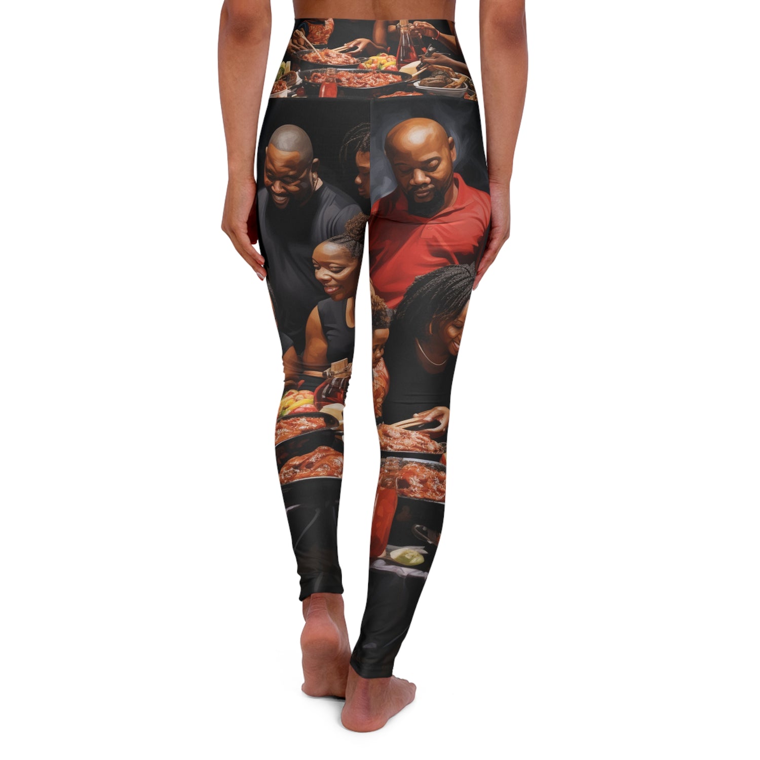 Put on a statement piece that will have all the heads turning! These leggings feature an ultra-realistic abstract oil painting of a black big family celebration with food being served in the background. Bold, vibrant and stylish - they are perfect for adding a fashion-forward touch to all your outfits. #blackfamily #oilpainting #familyleggings #blackcelebration #bigfamily #abstractleggings #stylemefabulous #funpatterns #urbanstyle #oilonclothing #happyfamily