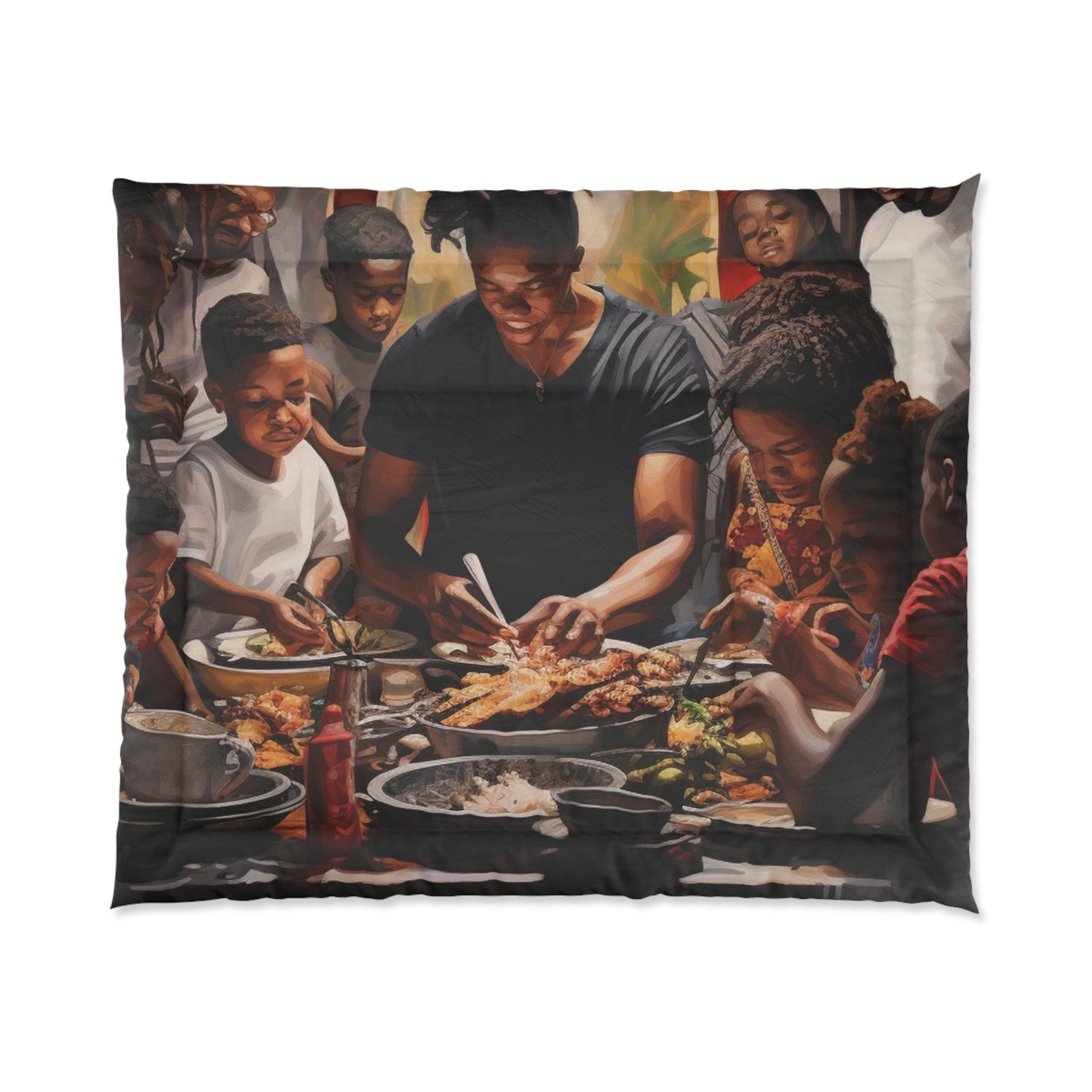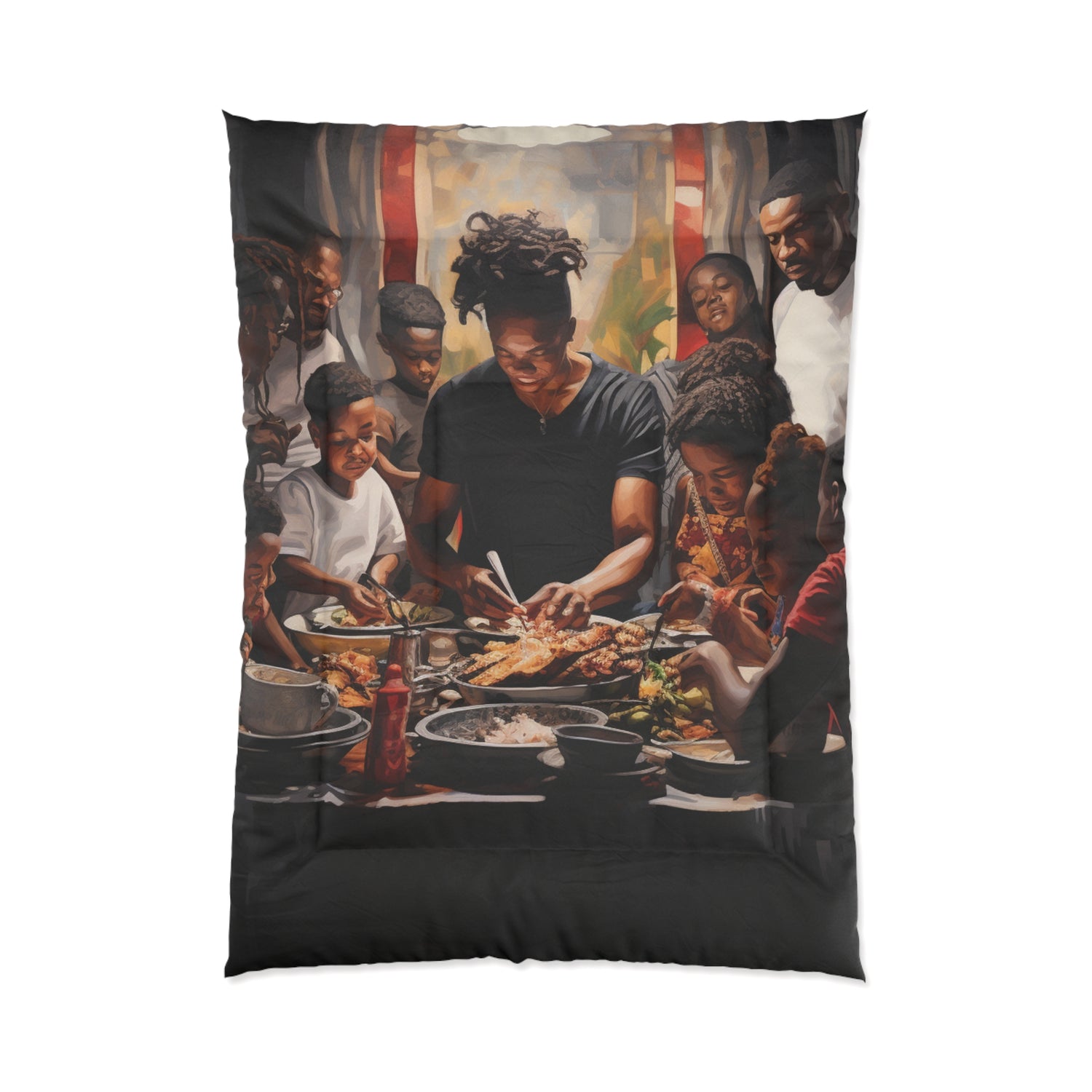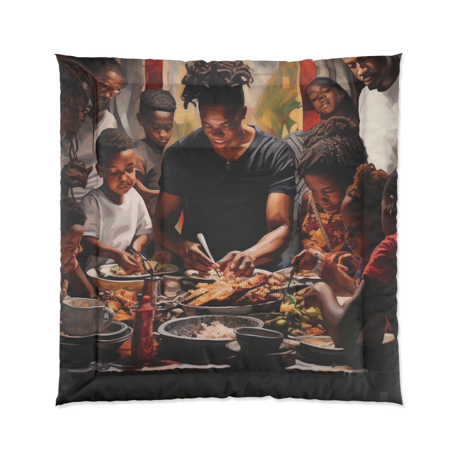 This ultra realistic abstract oil painting comforter will bring a sense of family unity and joy into your room. The bright colors of the black big family celebration in the painting are sure to uplift any atmosphere and bring positivity into your home. The food being served in the background hints at an abundance of love that is sure to give you a warm feeling when you cuddle up under this comforter. #FamilyLove #BigFamily #AbstractPainting #RealisticComforter #OilPainting #ComfyHome #BigCelebration #BlackFamily #AbstractArt #AbstractDesign #UnifiedFamily