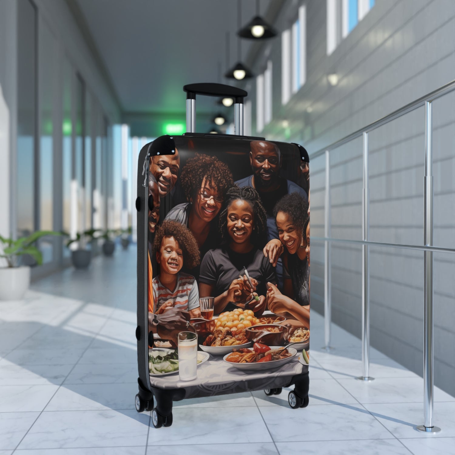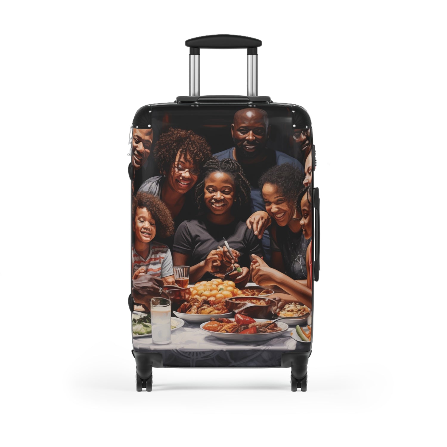This abstract oil painting of a big black family celebration is ultra realistic and full of life! You can almost feel the happiness radiating from the canvas. The food in the background amplifies the warm and inviting atmosphere. This suitcase of art brings smiles and joy to any home. #blackfamily #ultrarealistic #oilpainting #family #celebration #abstractpainting #artwork #decorative #festival #canvas #radiatinghappiness #satisfying