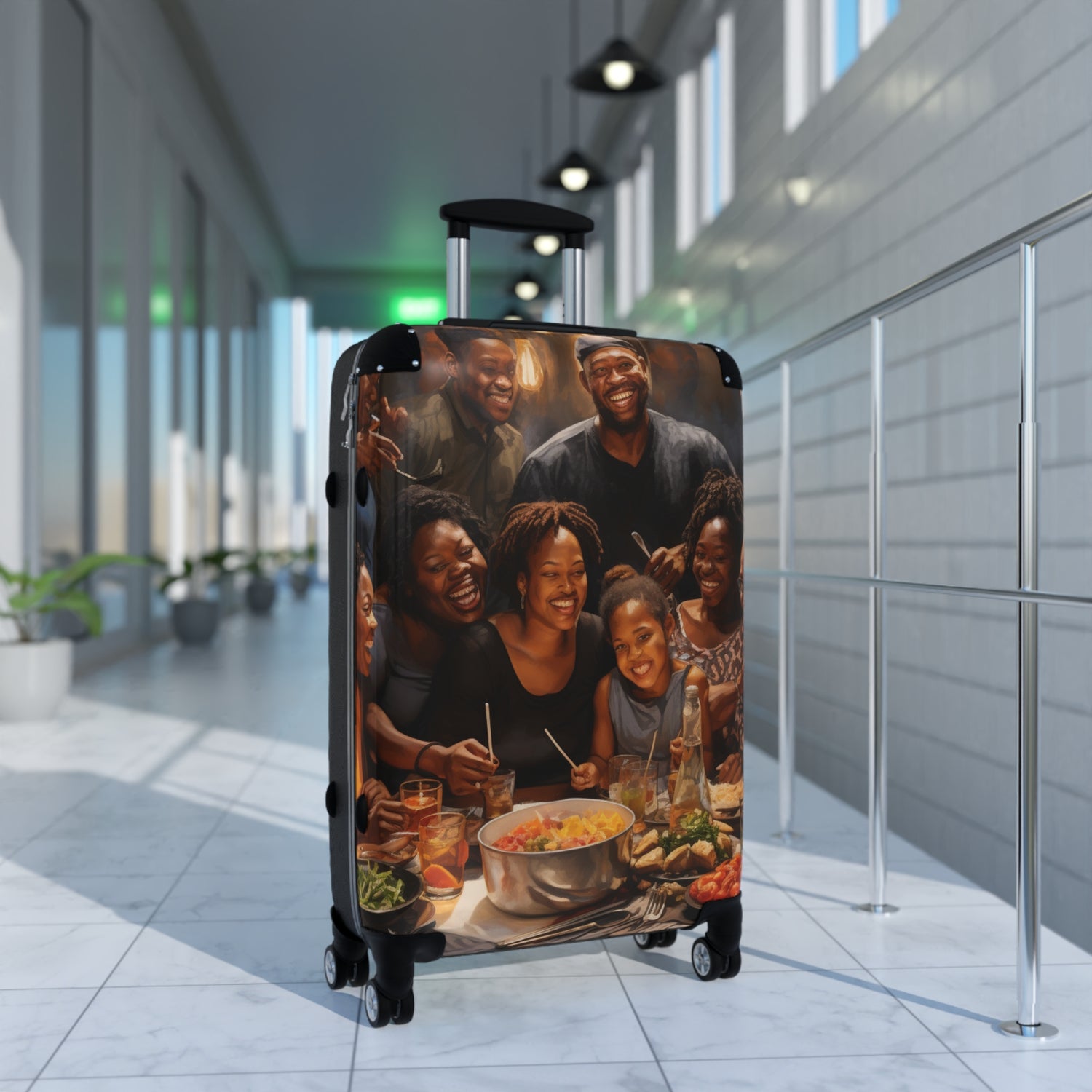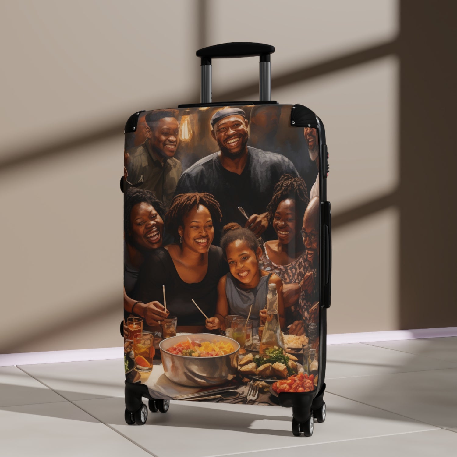 Bring the warmth of family celebration into your home with this ultra realistic abstract oil painting of a black big family celebration. The detailed brush strokes and vivid colors accentuate the joyousness of loved ones coming together. The painting depicts a beautiful outdoor setting with food being served in the background. Special occasions deserve to be remembered always with this timeless piece. #painting #blackfamily #arts #familycelebration #realistic #abstract #oilpainting #homeindoors #suitcase #handmadeart #personalizeandgift