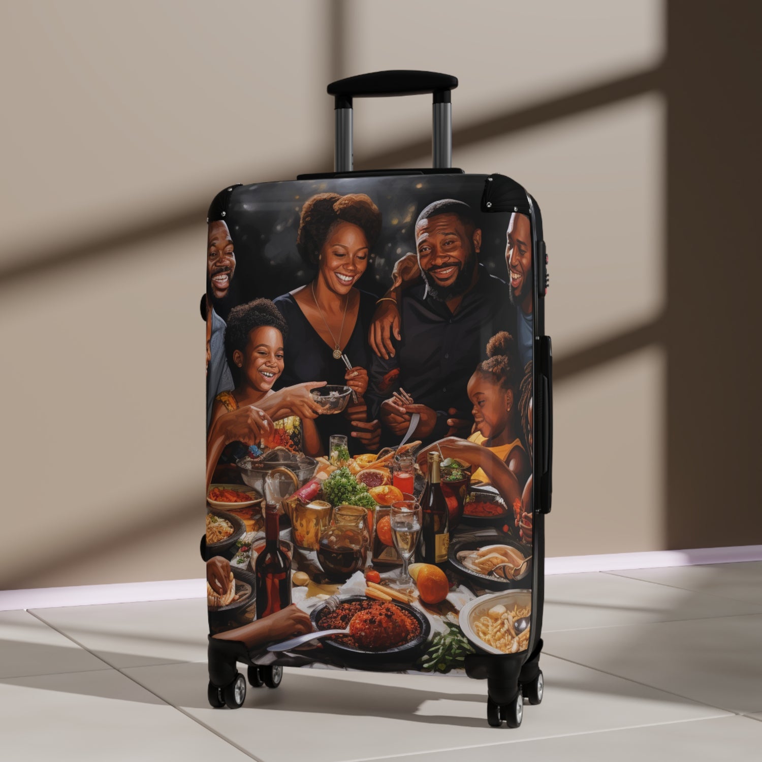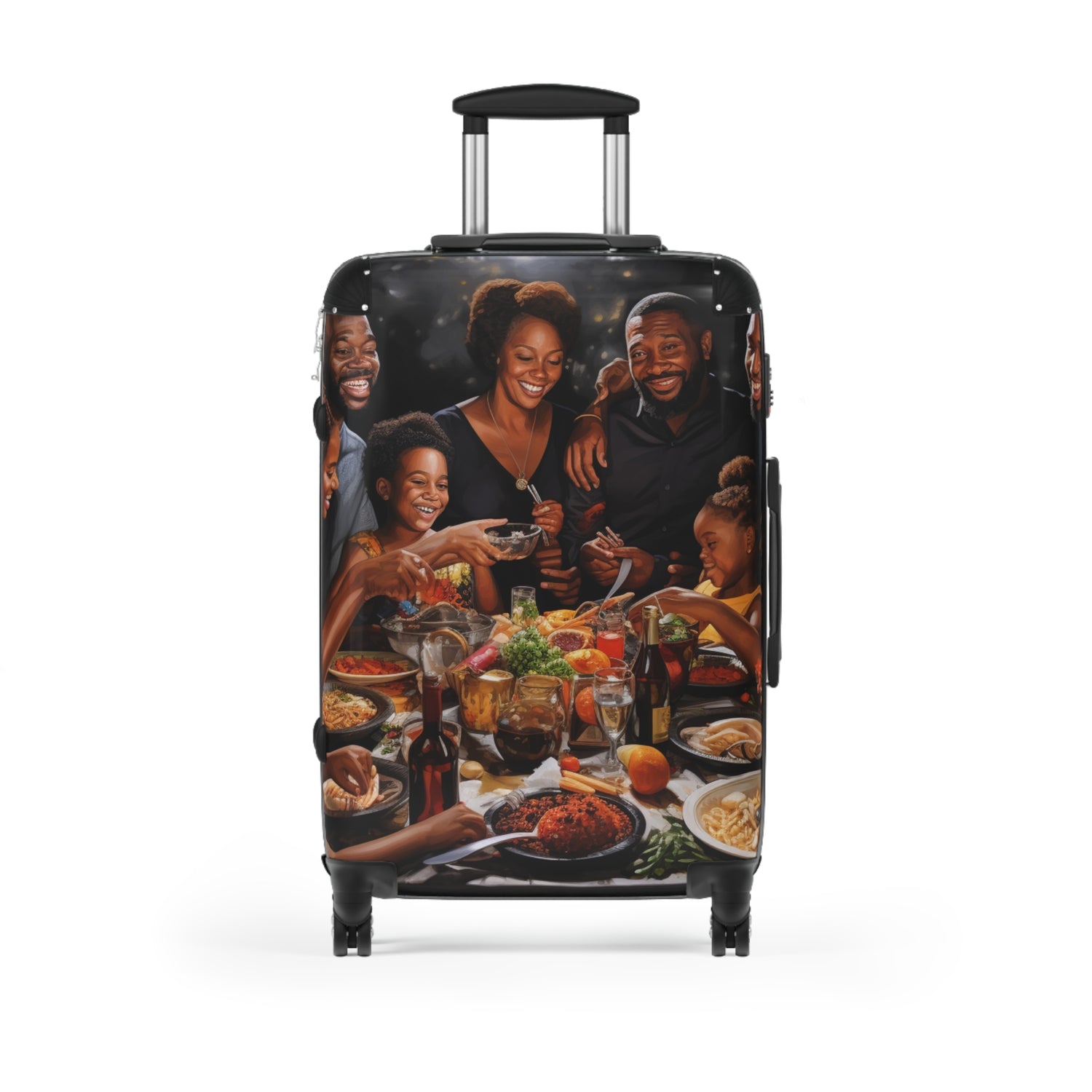This intricate oil painting portrays a big black family celebrating in a realistic and abstract way. You can see a lavish spread of food that takes up the background of the painting. Get this ultra realistic abstract oil painting and display it proudly in your home. Perfect for adding a sense of comfort and joy just like a family celebration brings. #oilpainting #blackfamily #familycelebration #abstractpainting #comforting #ultrarealistic #cosy #luxurious #homemaking #celebration #contentment
