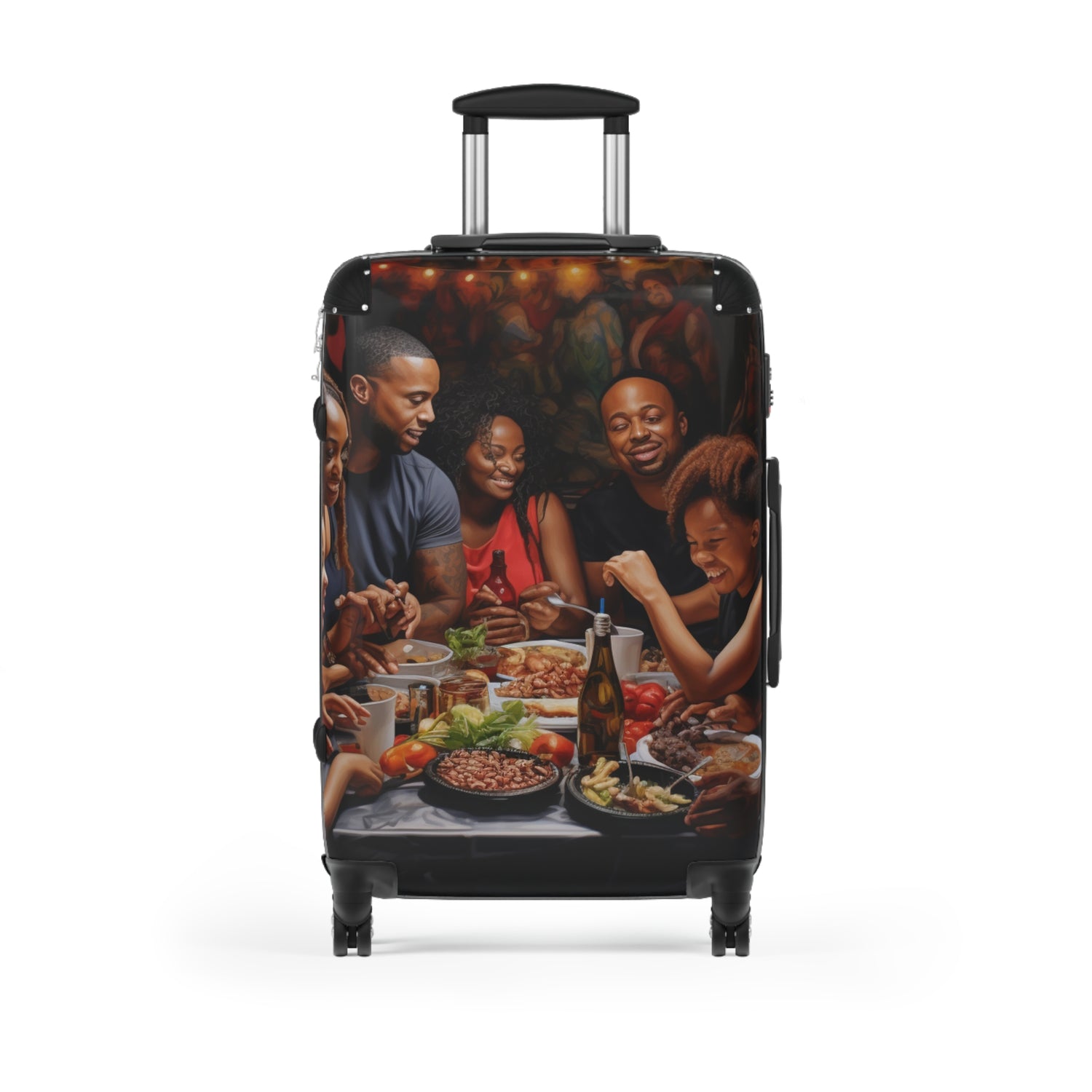 Add a modern twist to your home décor with this gorgeous ultra realistic abstract oil painting of a black big family celebration! Rich accents of colorful food being served in the background provide a warming touch to any environment this painting is hung. Display this stunning painting in your living area to spruce up the look and feel of your home. #oilpainting #abstract #blackfamily #celebration #suitecase #livingroom #homedecor #homeaccessories #wallart #homedesign #interiordesign