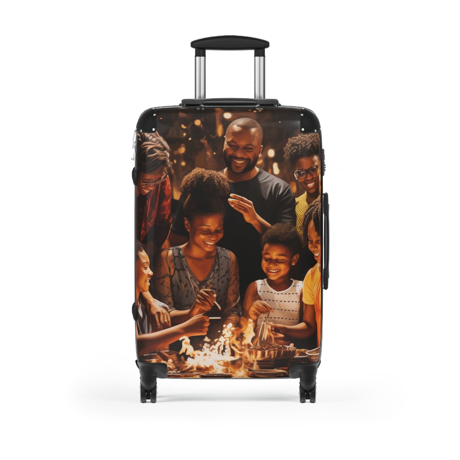 This amazing suitcase containing an ultra-realistic abstract oil painting of a black big family celebration is the perfect way to commemorate past family gatherings. You can almost almost smell the food that's served in the background. This unique and beautiful piece is sure to warm your heart and brighten up your living space! #blackfamily #oilpainting #artwork #suitcase #familylove #lifecelebration #familygatherings #museumqualityart #contemporaryart #interiorart #oilart