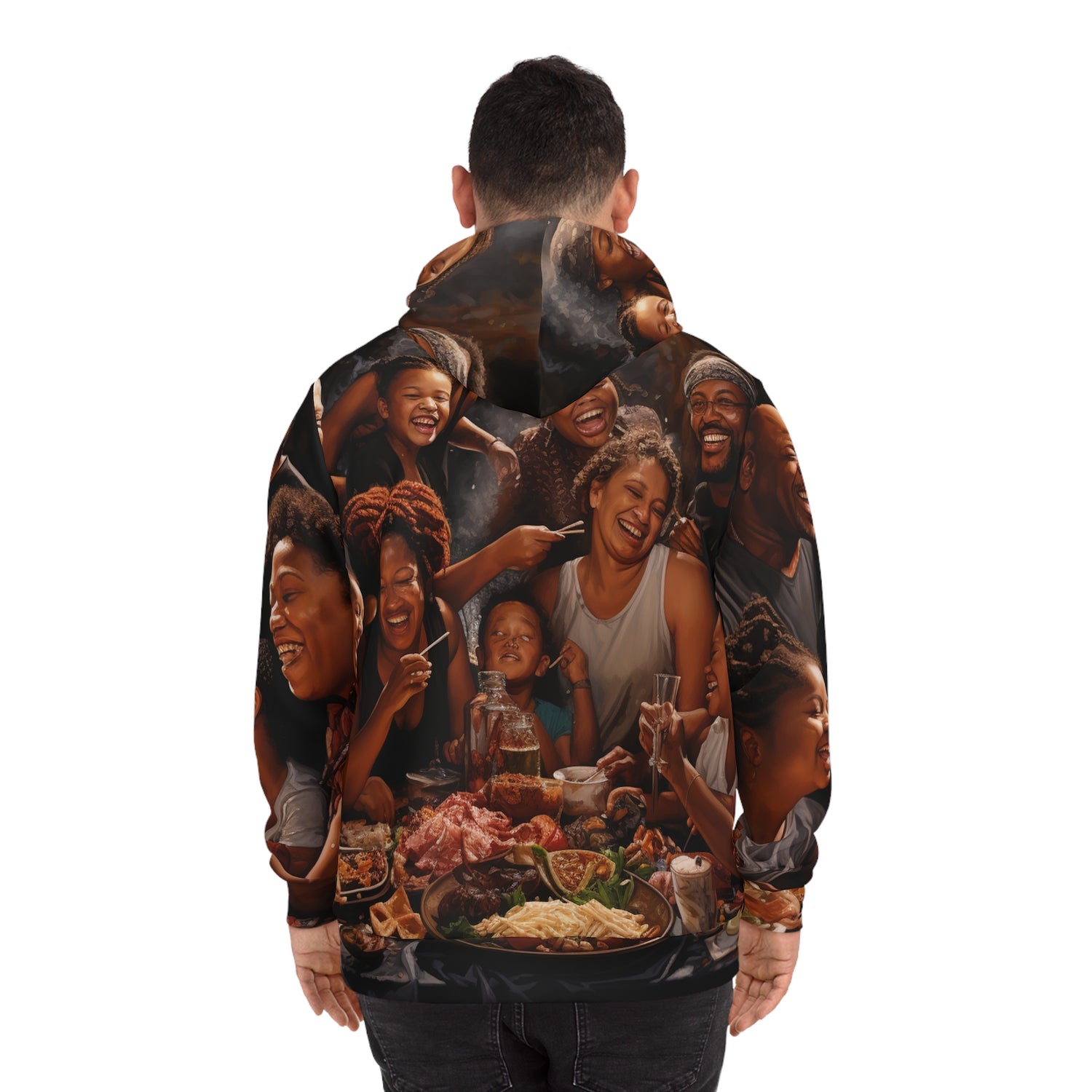 This hoodie features an ultra realistic abstract oil painting of a large black family gathering. The vibrant colors and life-like renderings of people, food and celebration radiates with energy from the quality fabric and stitching. With cool hues dominating the scene, you will be reminded of the joys of family and comradery. #blackfamily #hoodie #happyfamily #oilpainting #familygathering #abstractpainting #realisticpainting #familycelebration #bigfamily #fabricandstitching #rememberingjoys