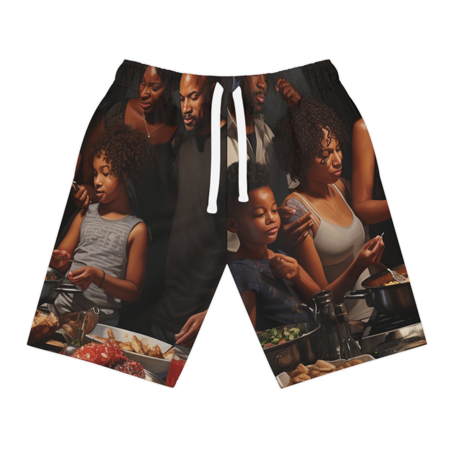 Create a unique style statement with these ultra-realistic abstract oil painting shorts. They feature a lively black family reunion, with delicious food served in the background. Match with basic colors to let the pattern pop, and add a touch of freshness to your modern wardrobe. #blackfamily #familyreunion #uniquefashion #shortslovers #oilpainting #streetstyle #modernwardrobe #stylestatement #streetwearfashion #abstractpainting #outfitinspo