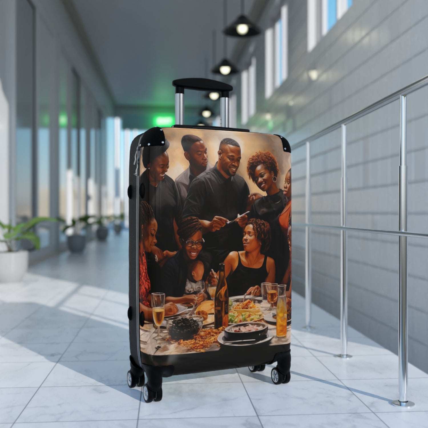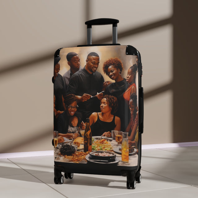 This ultra realistic abstract oil painting of a black big family celebration will bring life into your space. The scene depicts a joyful gathering of a close-knit family with delicious food being served in the background. With this masterpiece of a suitcase, you can show off your personality and style. #blackfamily #abstract #oilpainting #painting #celebration #family #realistic #ultra #suitcase #colorful #biggathering