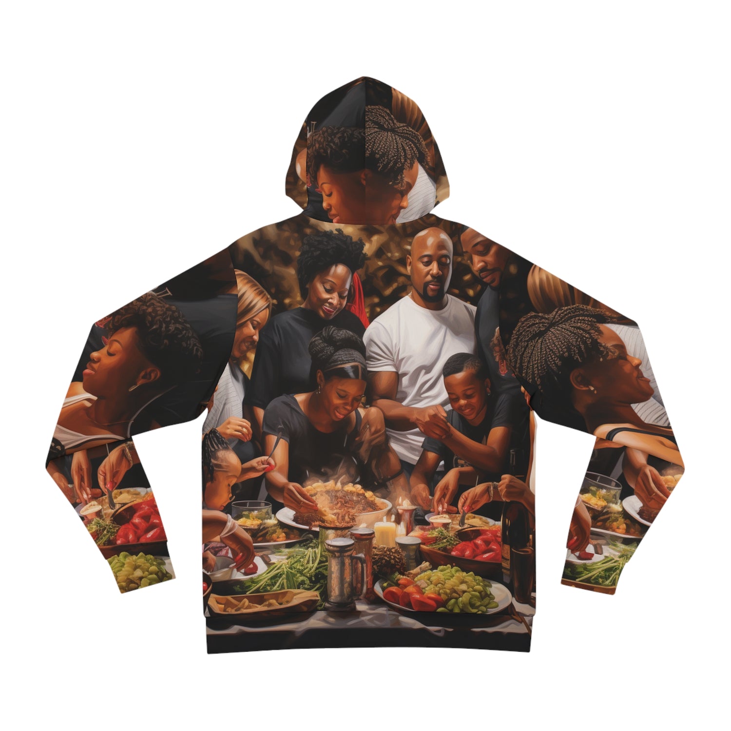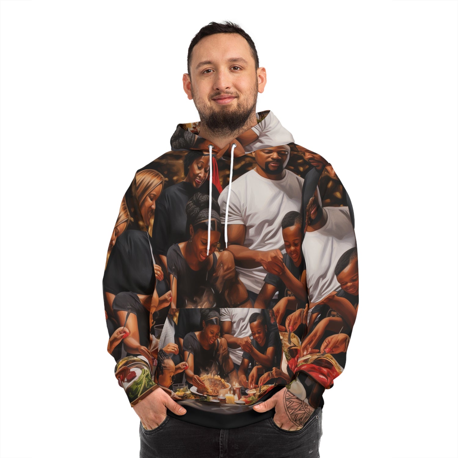 This ultra realistic abstract oil painting hoodie will make a statement. Featuring a black big family celebration with food being served in the background, this hoodie will catch attention. The artwork is printed on high quality fabric and crafted with perfection for ultimate comfort and style. Look stunning and feel great in this unique hoodie! #hoodie #blackfamily #family #oilpainting #abstractart #ultrarealistic #celebration #food #statementpiece #style #clothing