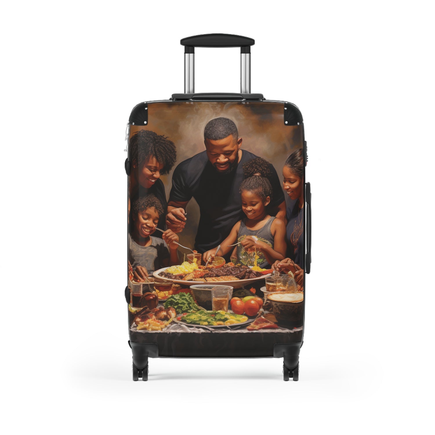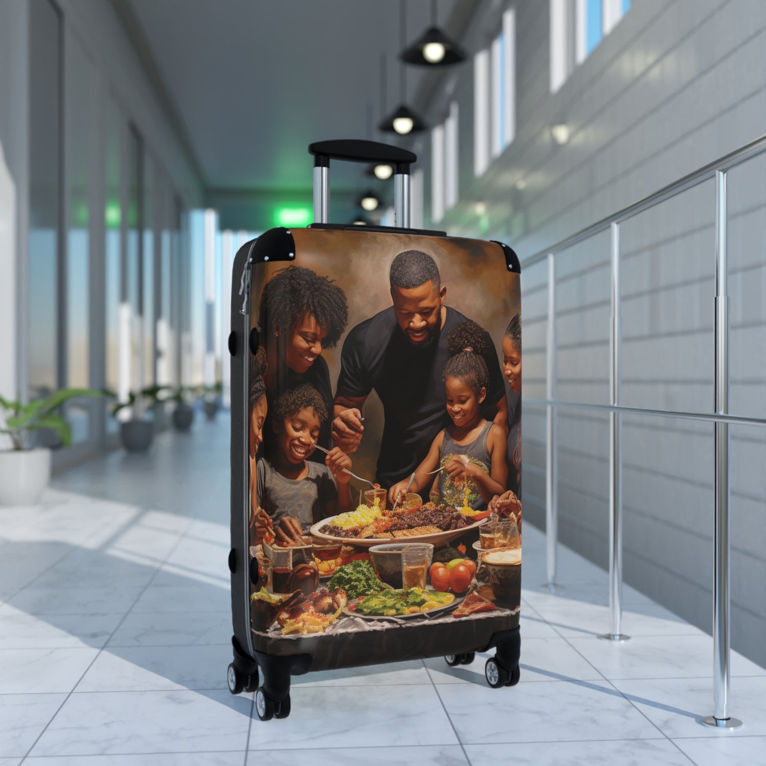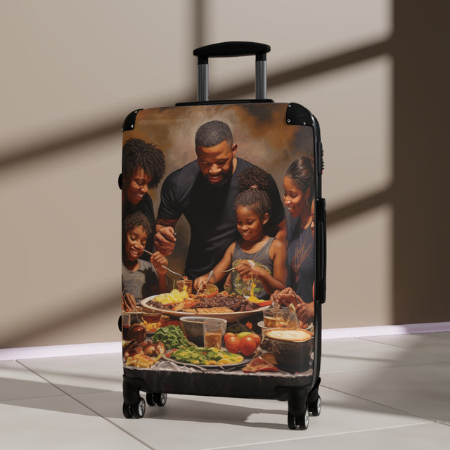 This ultra-realistic abstract oil painting of a black big family celebration is a true representation of an important event in one's life. With the food being served in the background, this piece adds colour to any room. Its vivid colours and lifelike details makes it a great addition to your home or office. Get this suitcase today and bring the celebration home with you! #FamilyCelebration #OilPainting #AbstractArt #AbstractOilPainting #AbstractRealism #BlackFamilyCelebration #RealisticPainting #HomeDecor #CelebrationPainting #PassionForArt #RealisticRetail