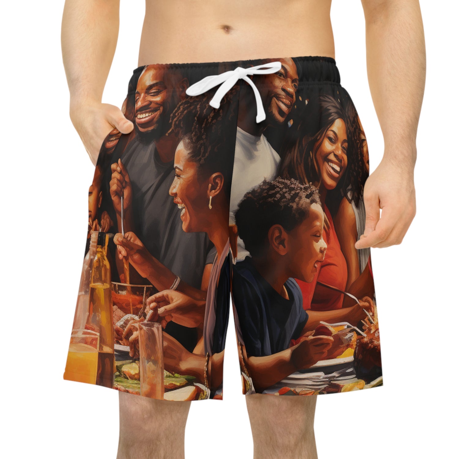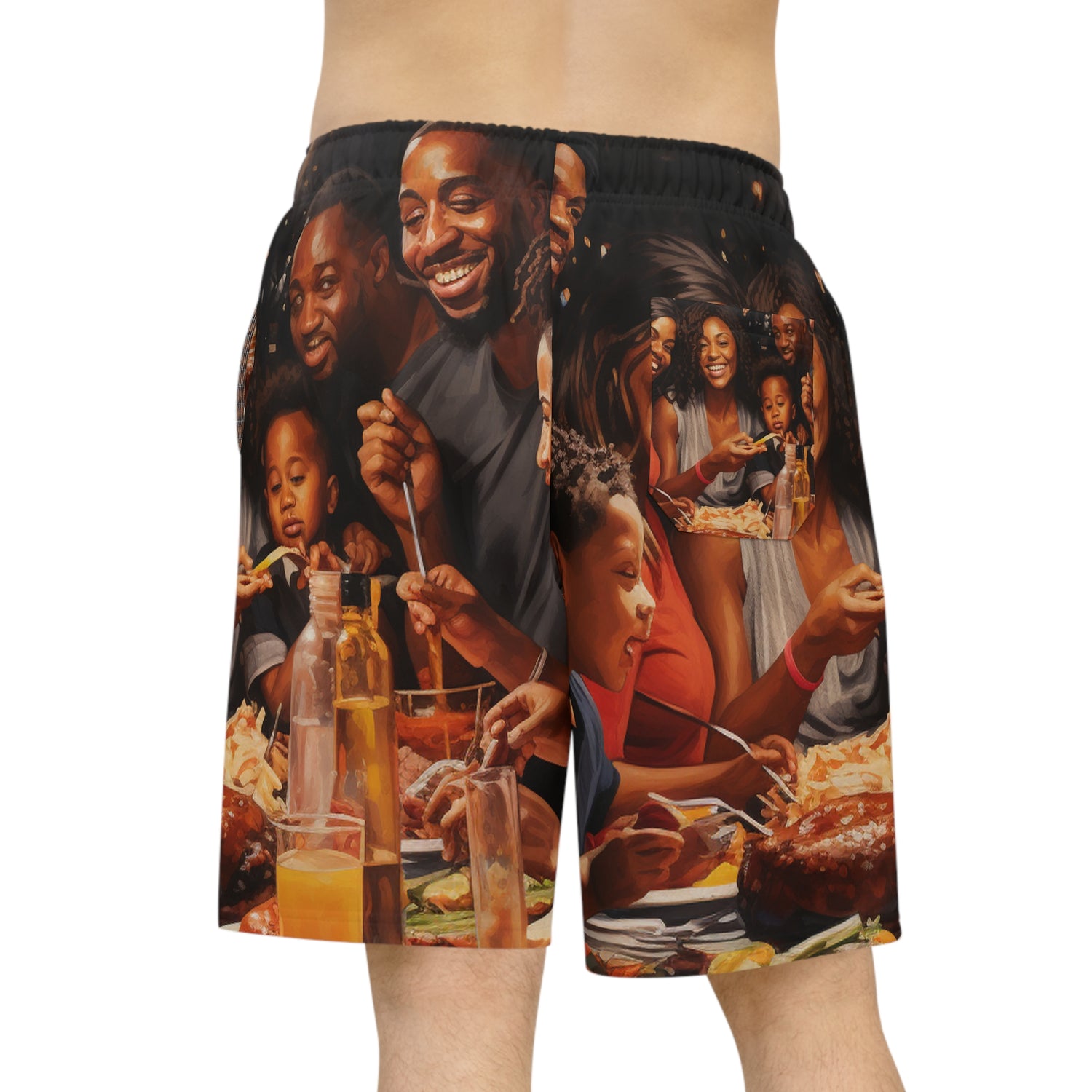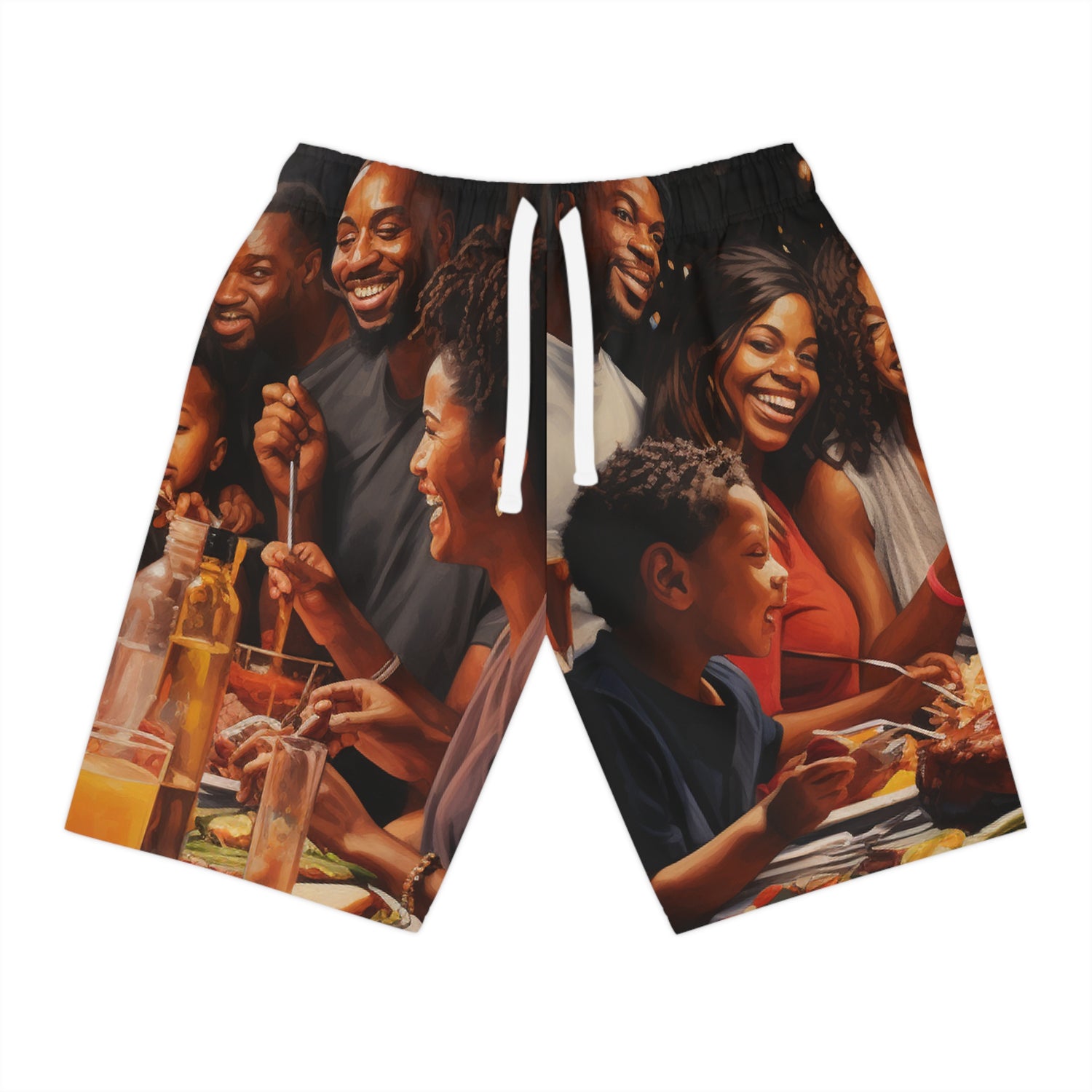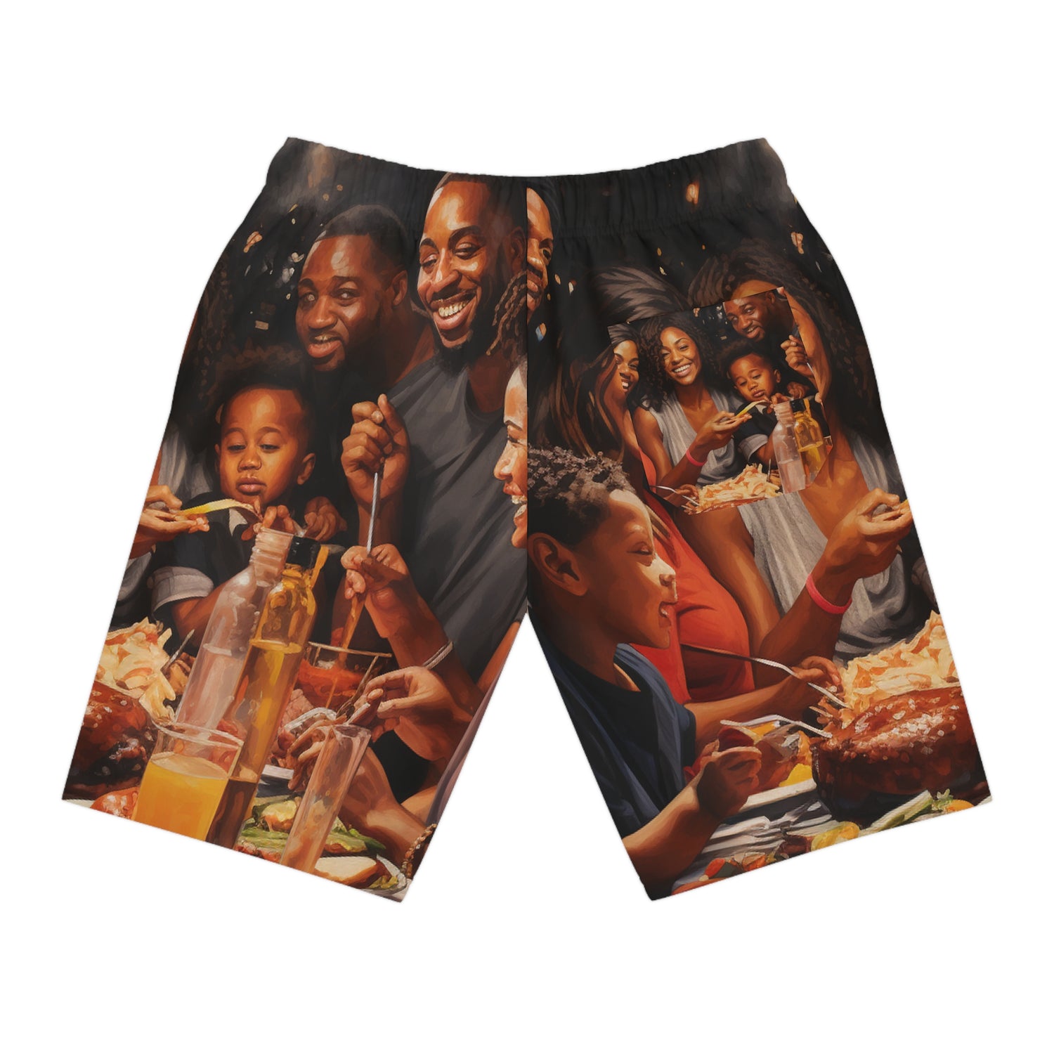 These abstract oil-painted shorts feature a vibrant image of a large black family in the midst of festivities. In the background, food is being served and everyone is engaged in conversation—an idyllic expression of the beauty of family and togetherness. Rich colors and an ultra-realistic style bring this painting to life and will surely be a staple of your wardrobe. #blackfamily #blackmoms #blackdads #familygathering #oils #art #shorts #youthfulstyle #celebration #fashion #comfyclothes