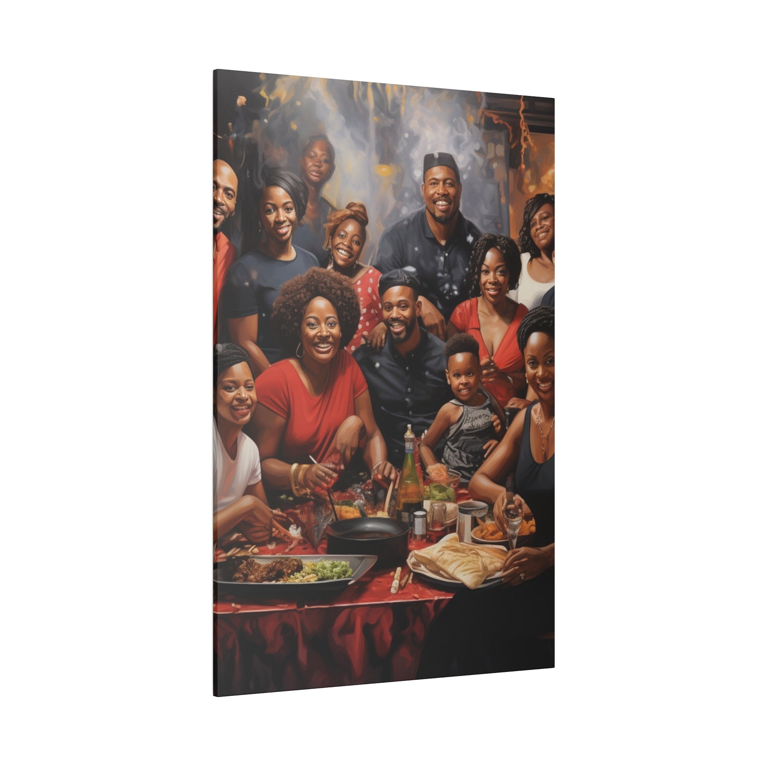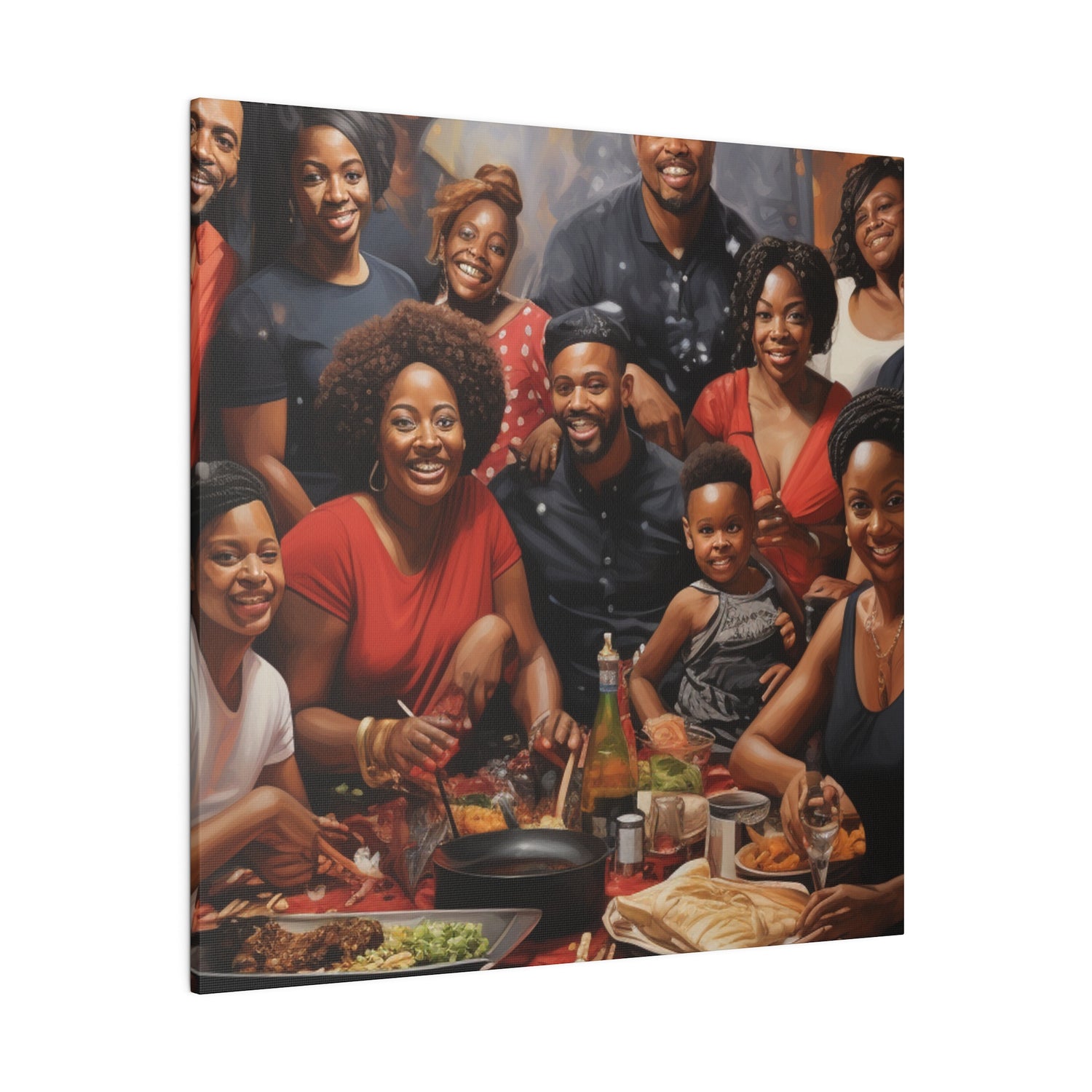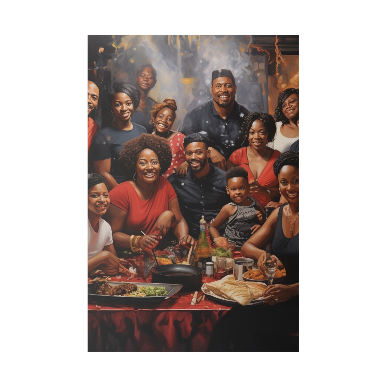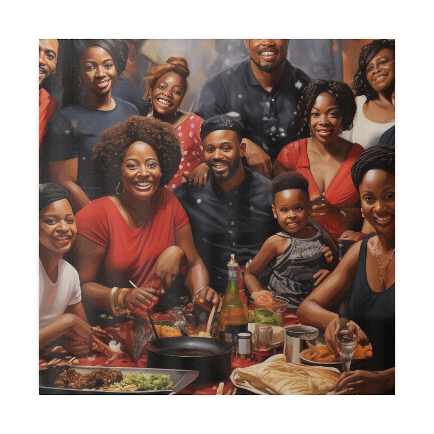 This vibrant canvas is the perfect edition to your home! An ultra realistic abstract oil painting of a black big family celebration with food being served in the background captures the beauty of great moments with family. Showcase your love for family and the bonds that hold them close for all to see. #family #love #blackfamily #celebration #abstractart #realism #oilpainting #canvas #moments #together #cherish