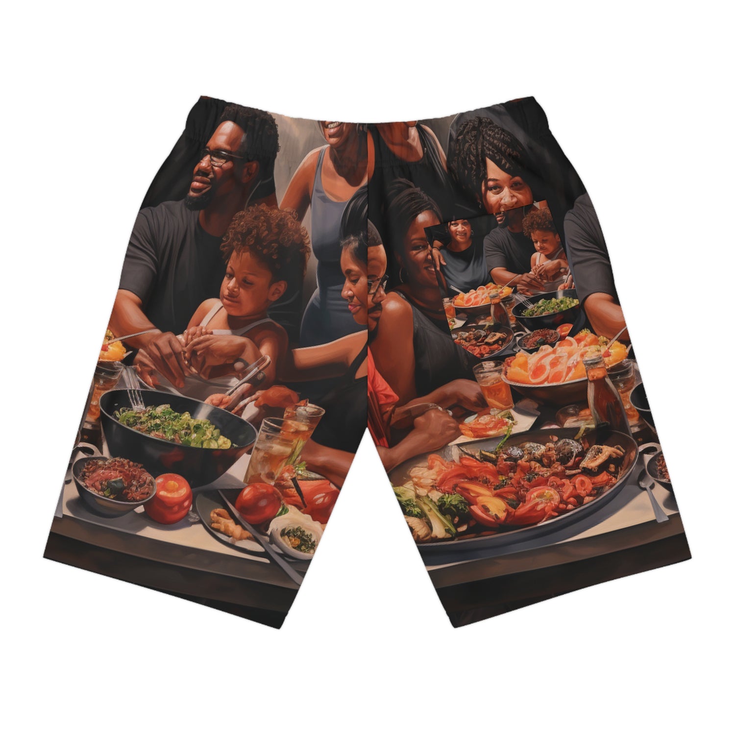 Introducing our ultra-realistic abstract oil-painting-style shorts! Capture the joy of family celebration with this stylish and comfortable outfit. The soft fabric featuring a colorful, energetic painting of a bountiful dining table with loved ones basking in the joyful moment. Express your appreciation for a special day with these casual and beautiful shorts! #familytime #joyfulmoments #ultrarealistic #abstractoilpainting #blackfamily #celebration #colorful #bountifultable #specialday #diningtable #comfortableclothing