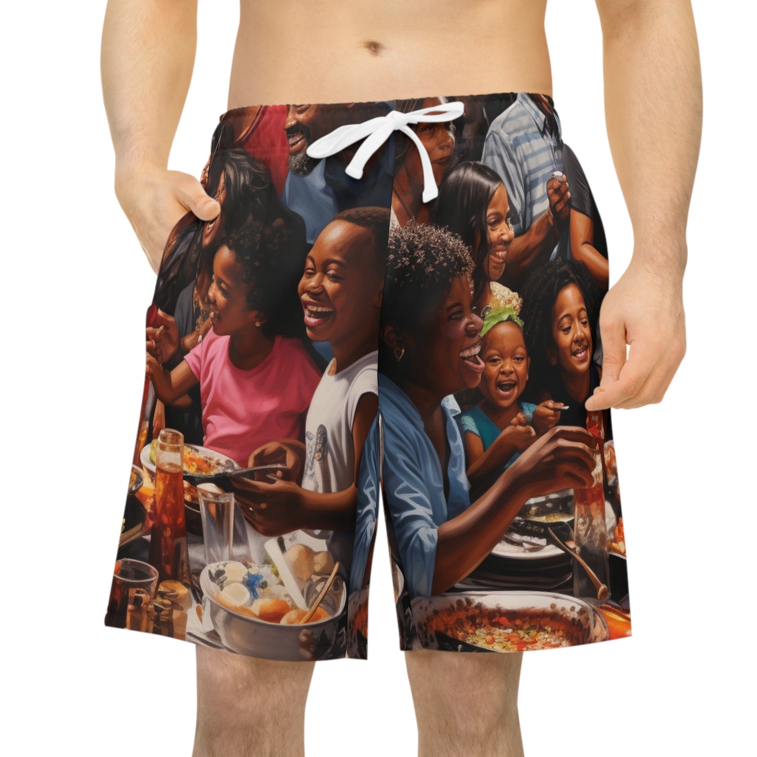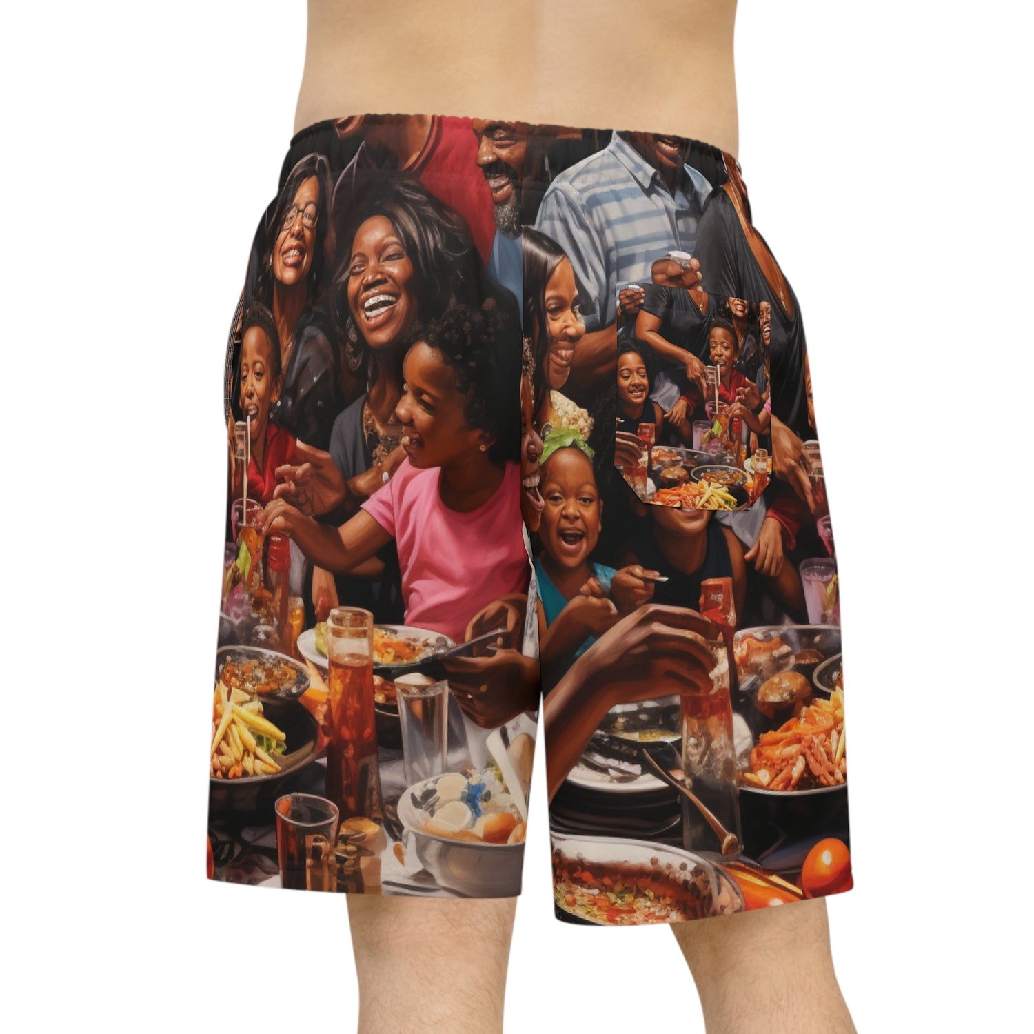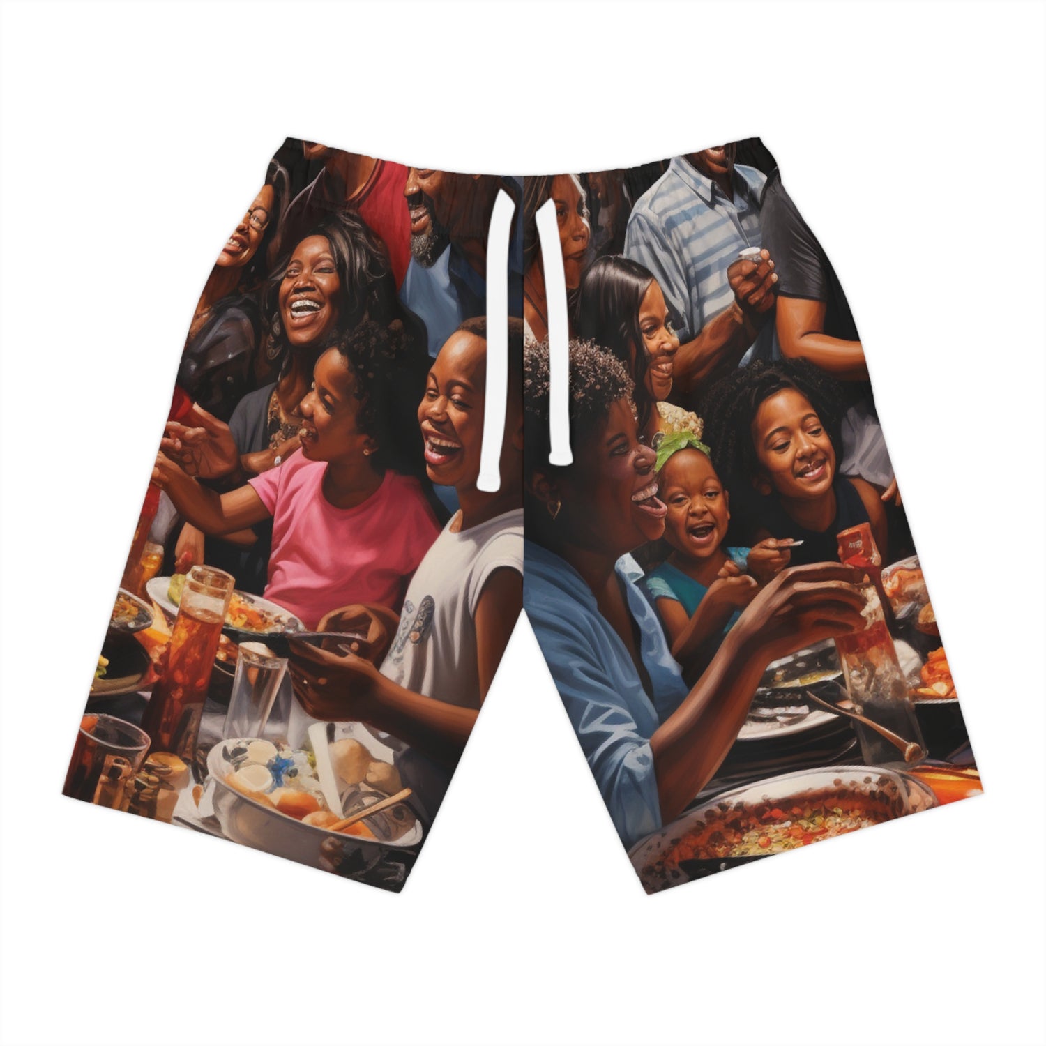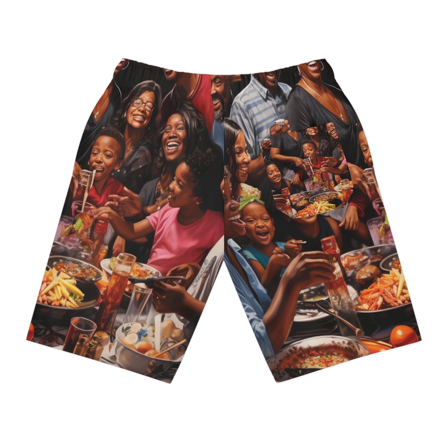 This eye-catching black family celebration oil painting will be the conversation starter of your wardrobe. Printed on ultra-realistic shorts using oil paints, the detail showcased on this painting brings life and energy to any ensemble. Don’t forget the delightful food being served in the background – including things like ribs, chicken and more. Get creative and wear this stunning piece to the beach or a barbecue and show off your unique style! #familycelebration #shorts #painting #art #oilpainting #blackfamily #realistic #style #unique #design #outfit #fashion